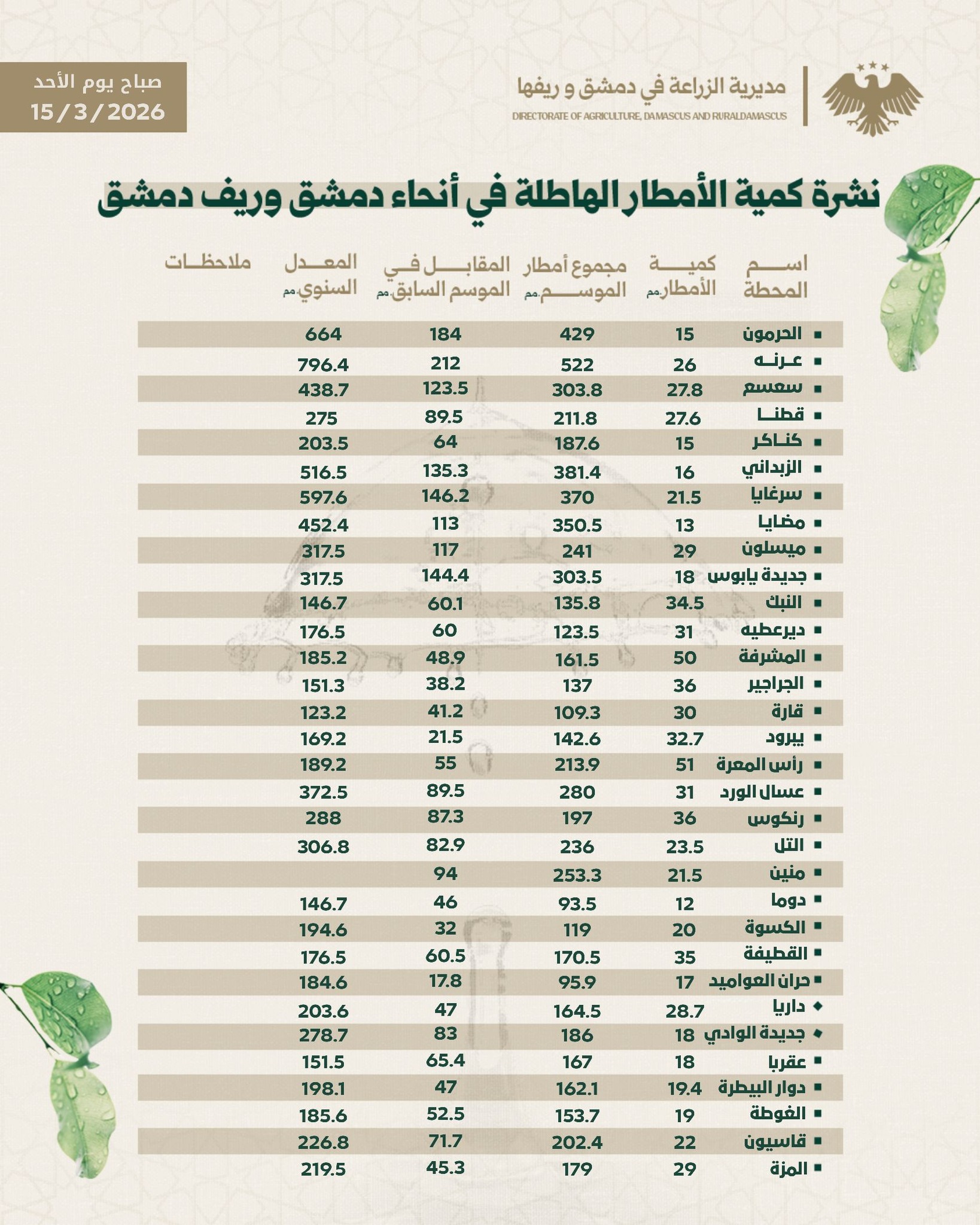 النشرة المطرية : يوم الأحد 2026-03-15