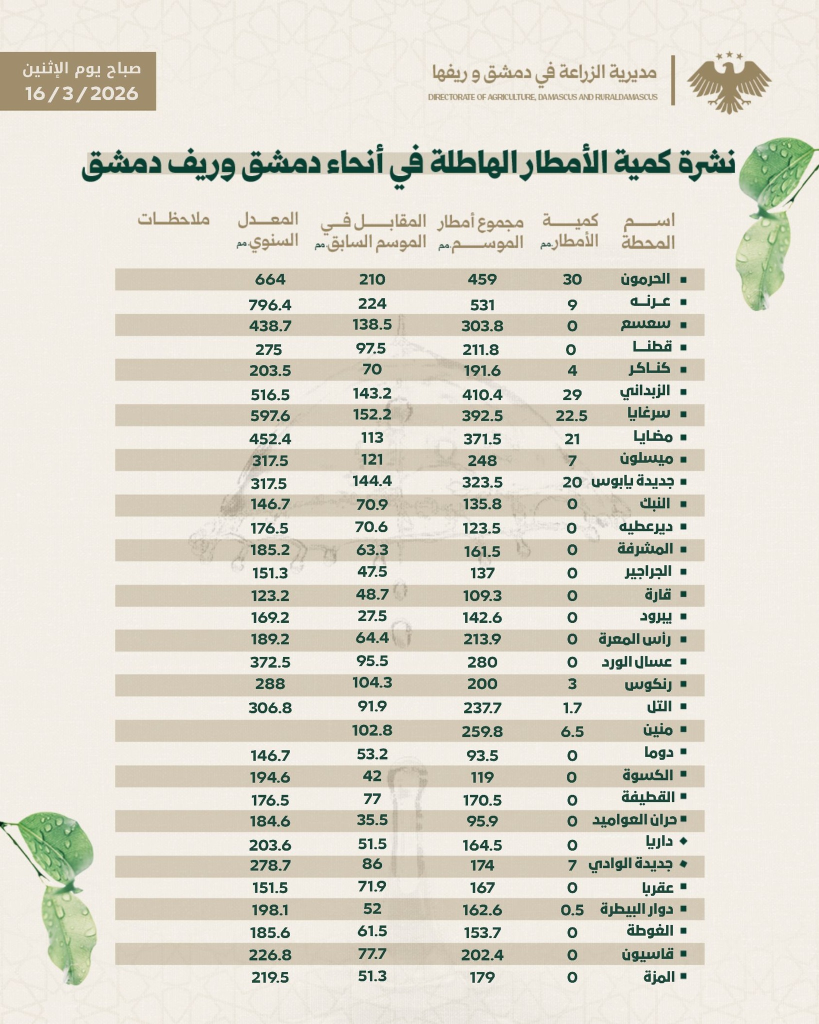 النشرة المطرية : يوم الأثنين 2026-03-16